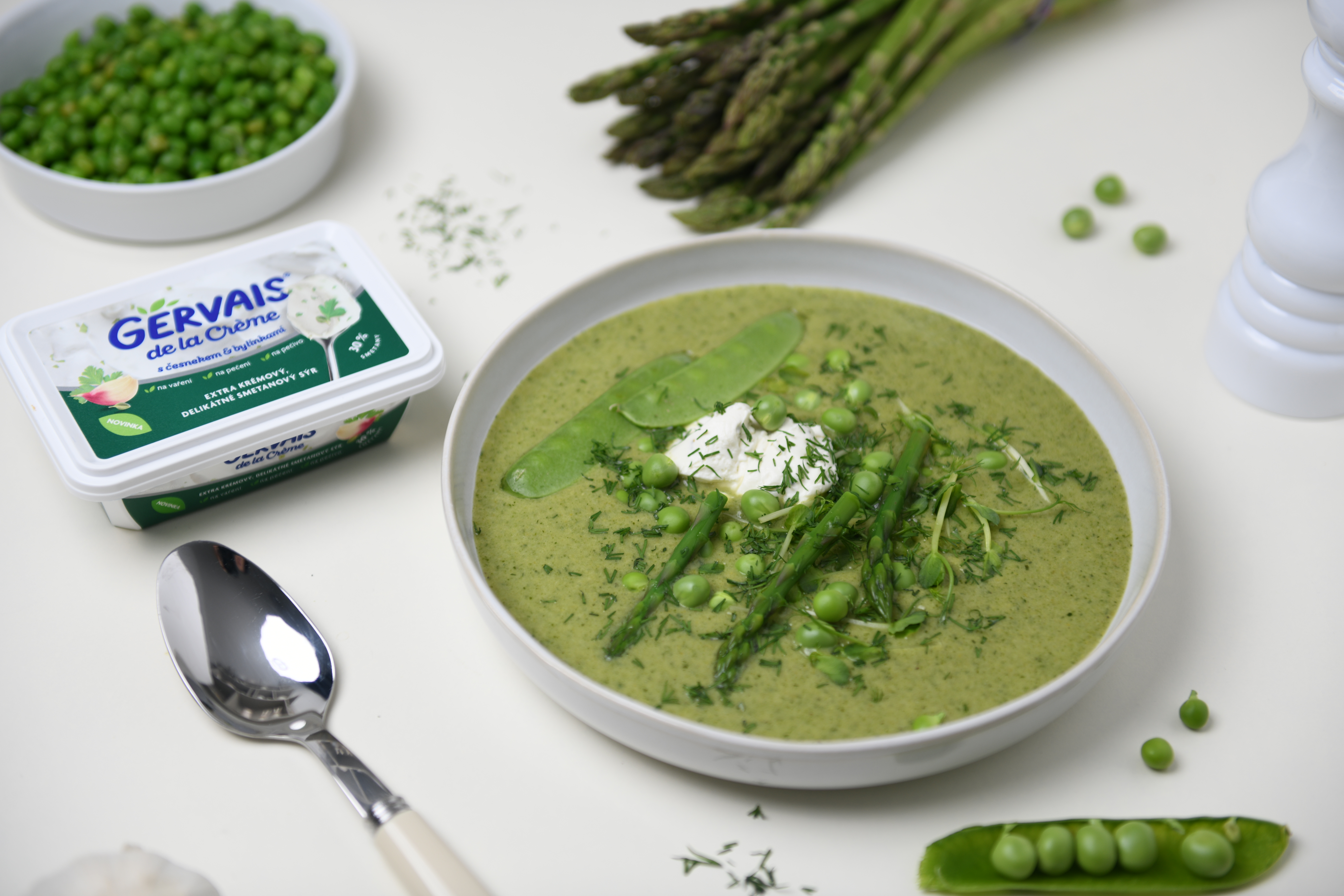 7. Navrch přidáme další lžíci Gervais de la Crème, hrachové výhonky, hrášek, plochý hrášek a posypeme kopr.