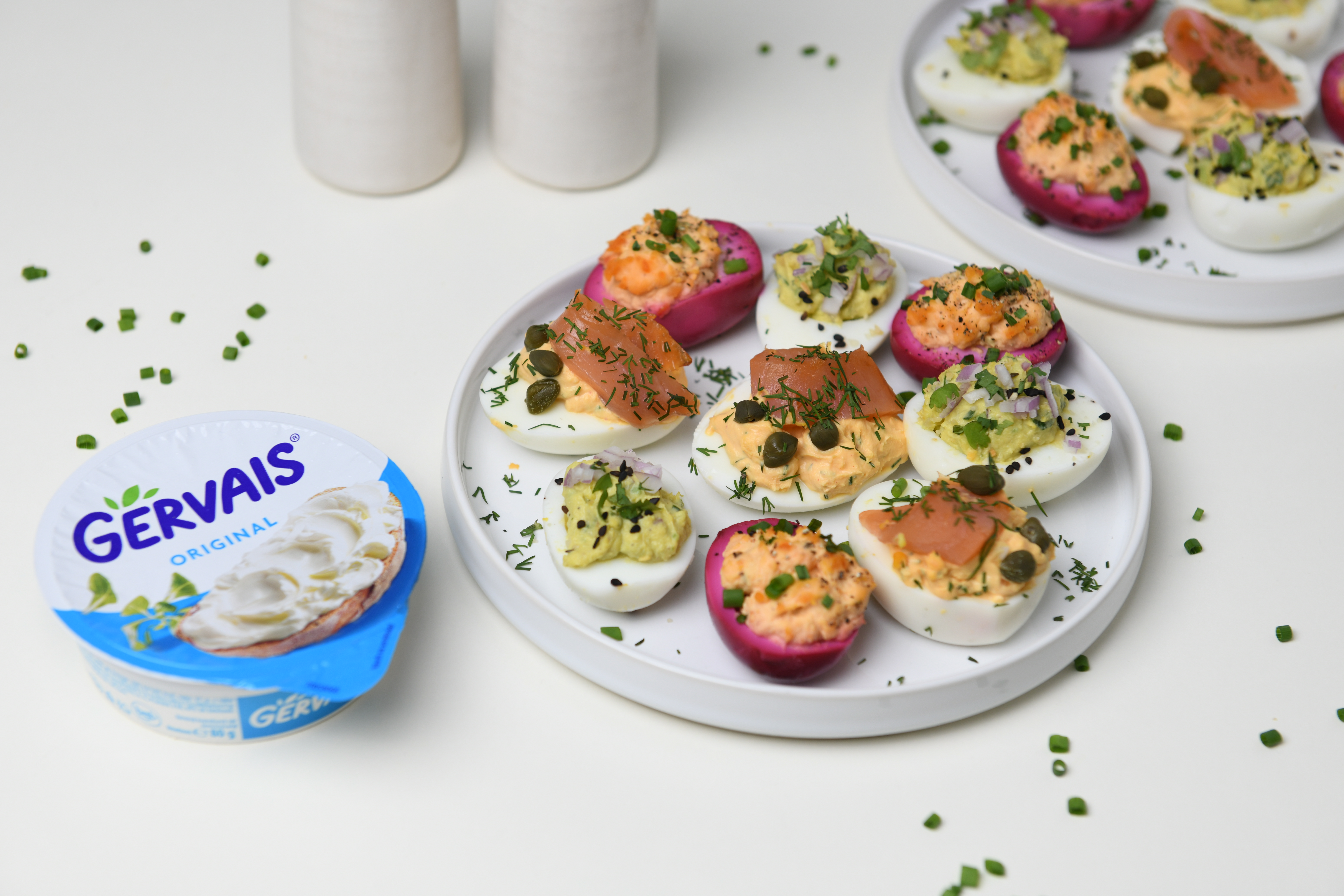 6. Žloutky smícháme s Gervais pažitkou, majonézou, hořčicí, solí, pepřem a promícháme dohladka.
